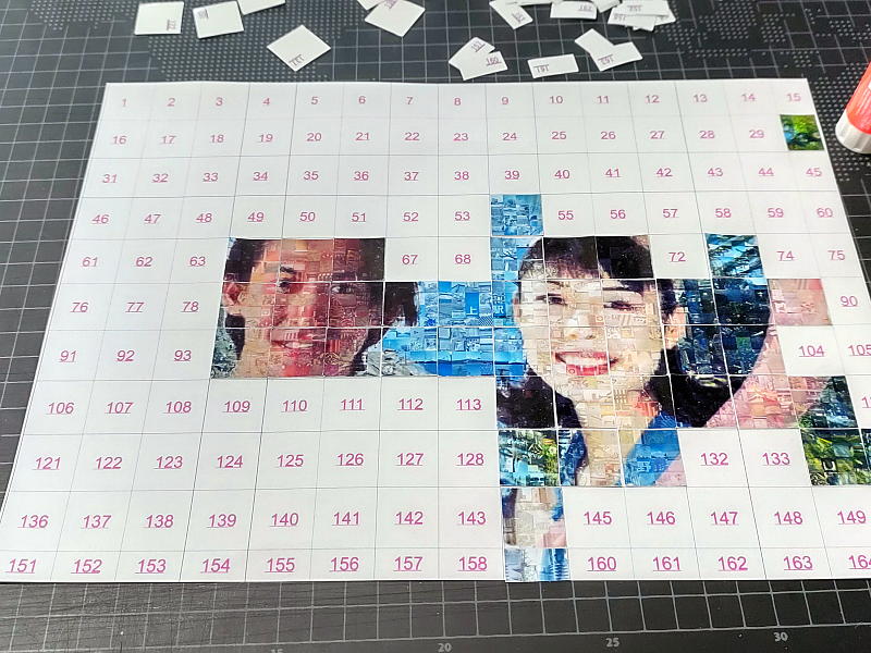 4.「ペーストモザイクアート制作」:写真を一枚いちまい貼り付けてモザイクアートを作っていく手法です。「1.モザイクアート一括制作」や「3.リアルタイムモザイクアート制作」で制作したモザイクアートに埋め込まれた写真一枚いちまい、または複数枚まとめて切り離します。切り離した写真をイベント等で、参加者や事務局が貼り付けていき、一枚のモザイクアートを完成させます。切り離した写真の裏には、どこに貼り付けるかの番号が記入されていますので、番号が記入された用紙に貼り付けて行きます。手で貼っていくというアナログな方法なので、小さいお子さんでも楽しめます。