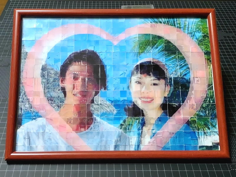 ③提供写真を重複利用して、きれいなモザイクアートを作る(提供写真が1回は埋め込まれているかどうかは気にしない) - 納 品 物 :①貼り付け用紙(A4サイズ) ②貼り付けパーツ(写真) ③参照用フォトモザイクアート印刷物(A5サイズ) ④簡易フォトフレーム(A4サイズ)