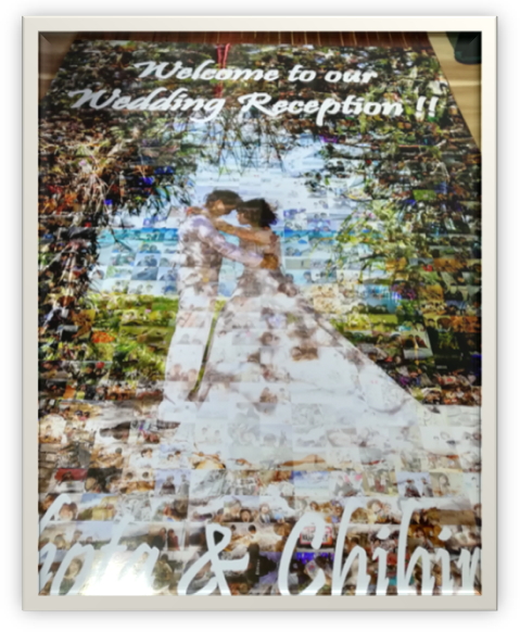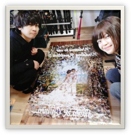 今回、結婚式のお祝いムービーの素材としてモザイクアートを利用させていただきました。なるべく費用を抑えて作成したいとご相談させていただき、見積もりをだしていただきました。代金の支払いから商品の到着まではとてもスムーズで大変助かりました。完成したお祝いムービー、モザイクアートには新郎新婦、ゲストにも大変喜んでいただき、ほんとうに大満足です。ありがとうございました。