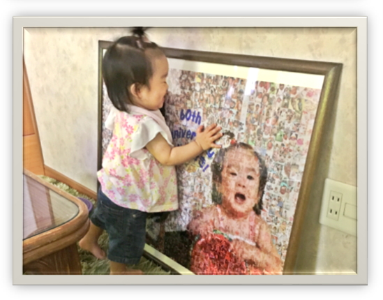 孫命な父の還暦祝いに、孫の写真を使ってモザイクアートをプレゼントしたいと考えたものの、ネットで色々見ていても金額が安い分使える写真の枚数に制限があったり、写真の配置が横向き統一しかできなかったり、納期が遅かったりとなかなか良い業者さんが見つかりませんでした。