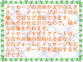 ◆ 作成中のバックにご希望のメッセージやイラストなどを入れることができます。フォトモザイクの元写真を表示しないため、どんなフォトモザイクができるか分からないので、写真を投稿する参加者の楽しみが倍増します。 ◆ これは一例で、投稿写真の枚数や背景の変更など、様々なカスタマイズが可能です。詳しくは【お問い合せ】ください。 | |
