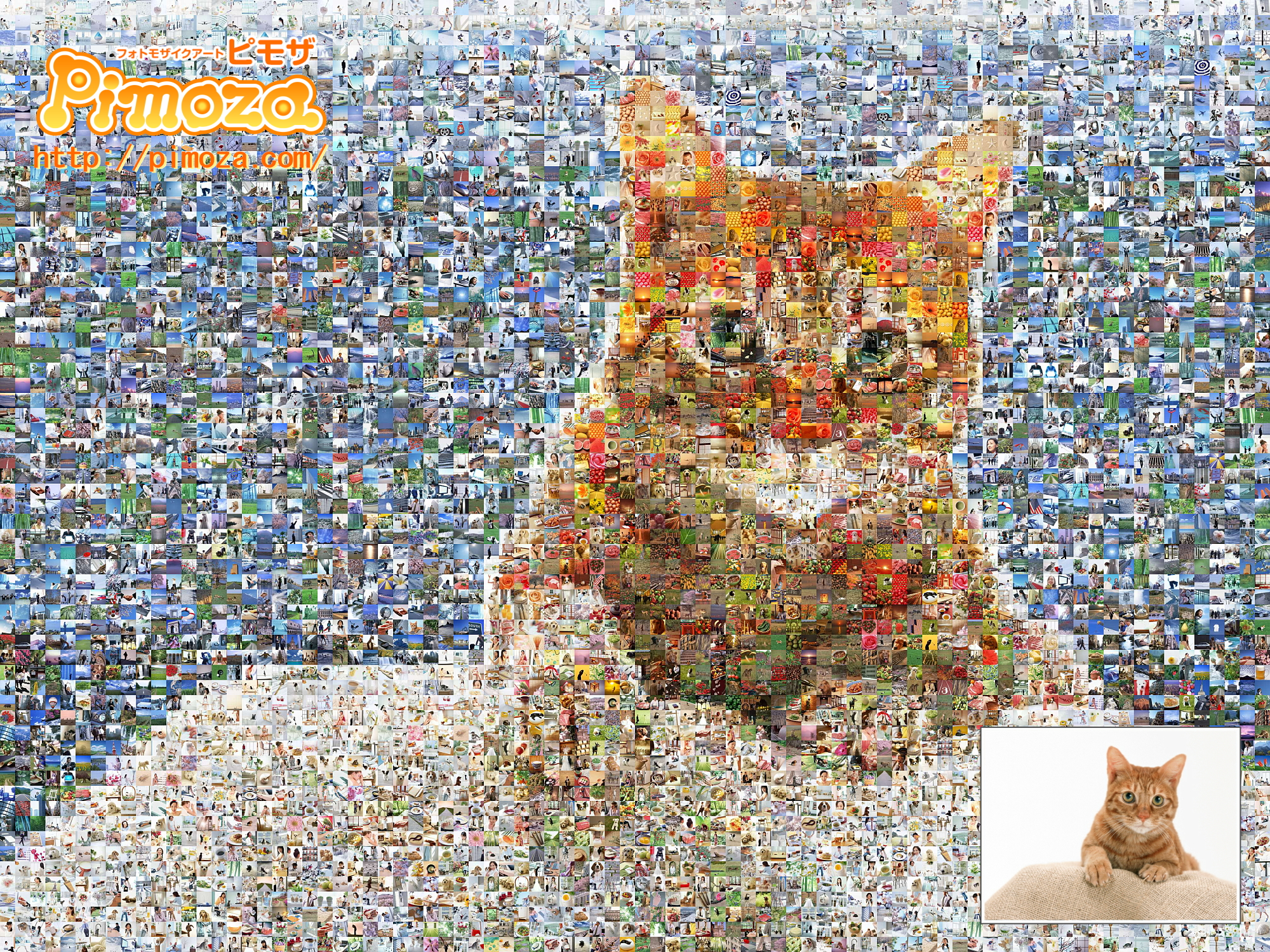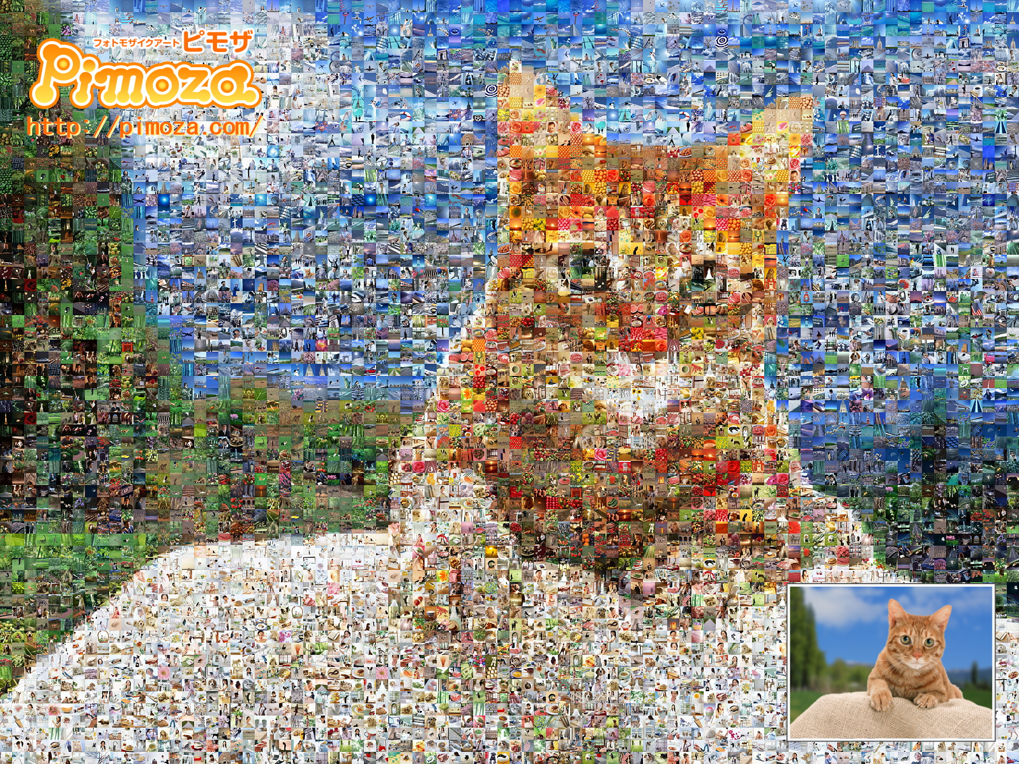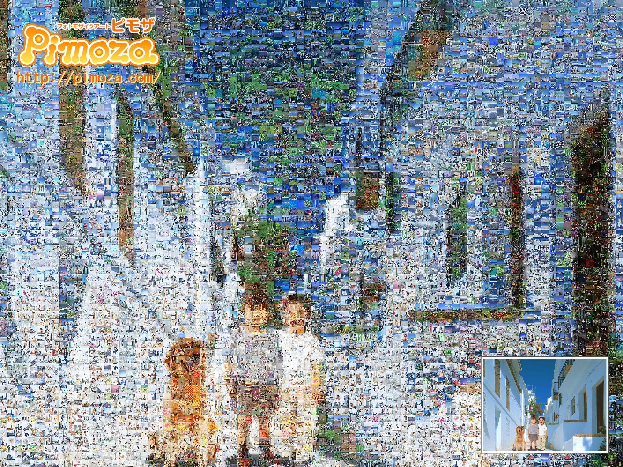 モザイクアート情報:・フォトパーツ形状=正方形 ・ベース画像合成度合い=0%(合成無し) ・埋め込みフォトパーツ数=5,292枚(約5,500枚の写真を2回重複利用して約11,000枚から自動選択。2回重複利用とは、準備したフォトパーツ用の写真が最大で2回使用されることですが、当社のシステムでは同一写真は隣接しないように自動制御しています)