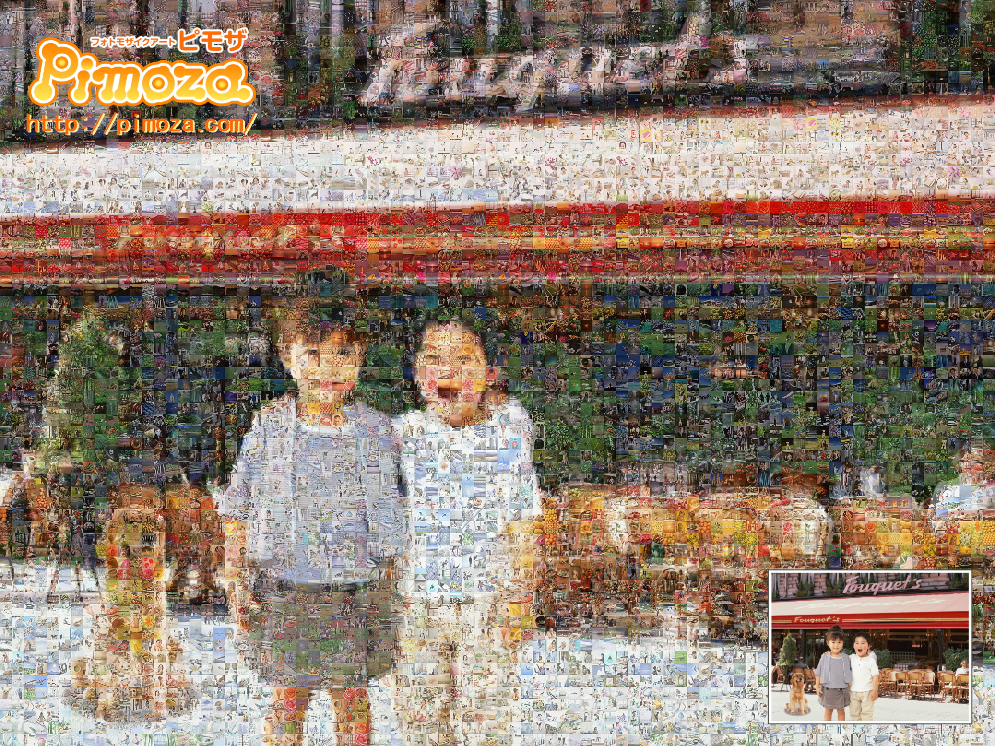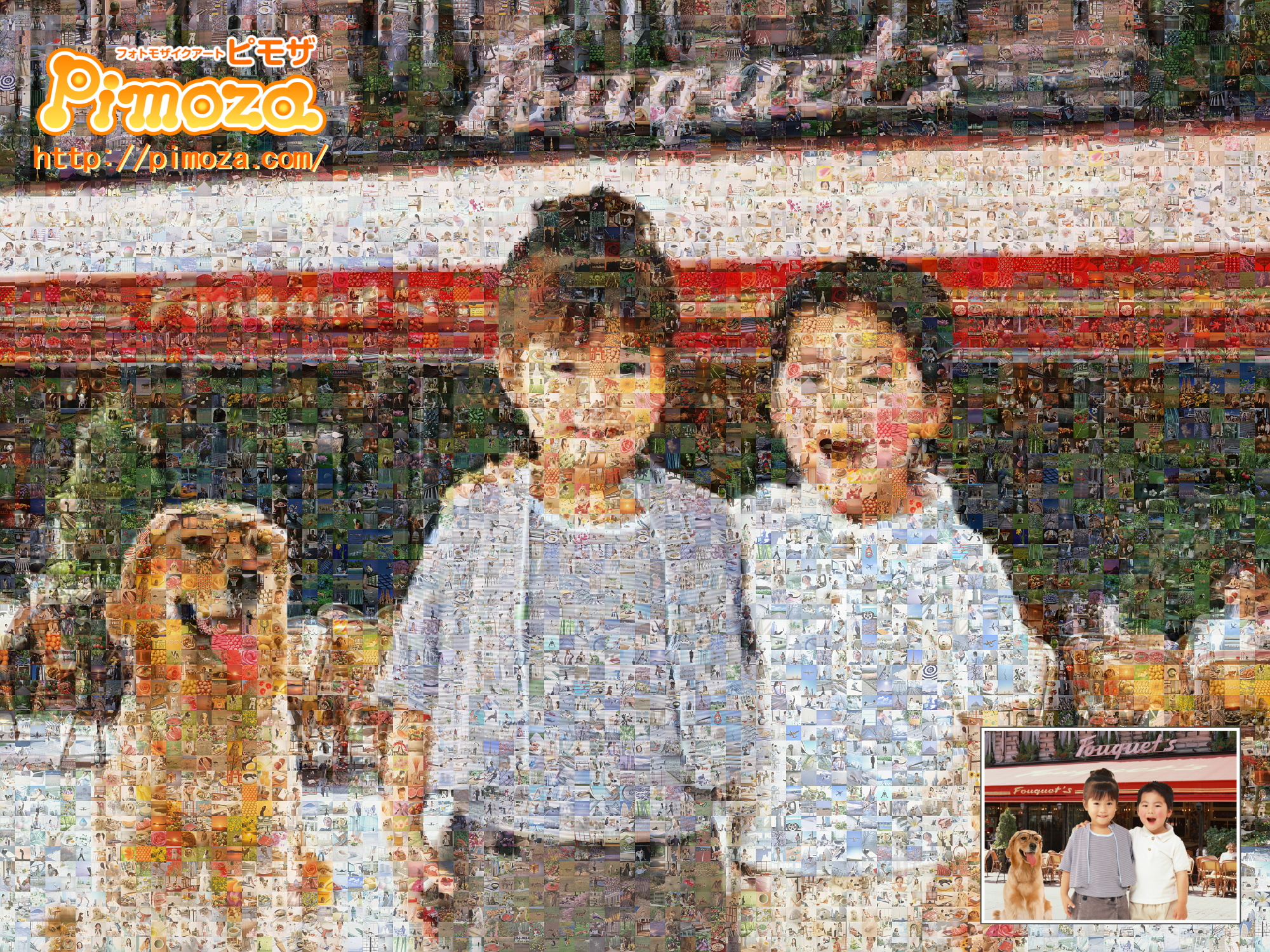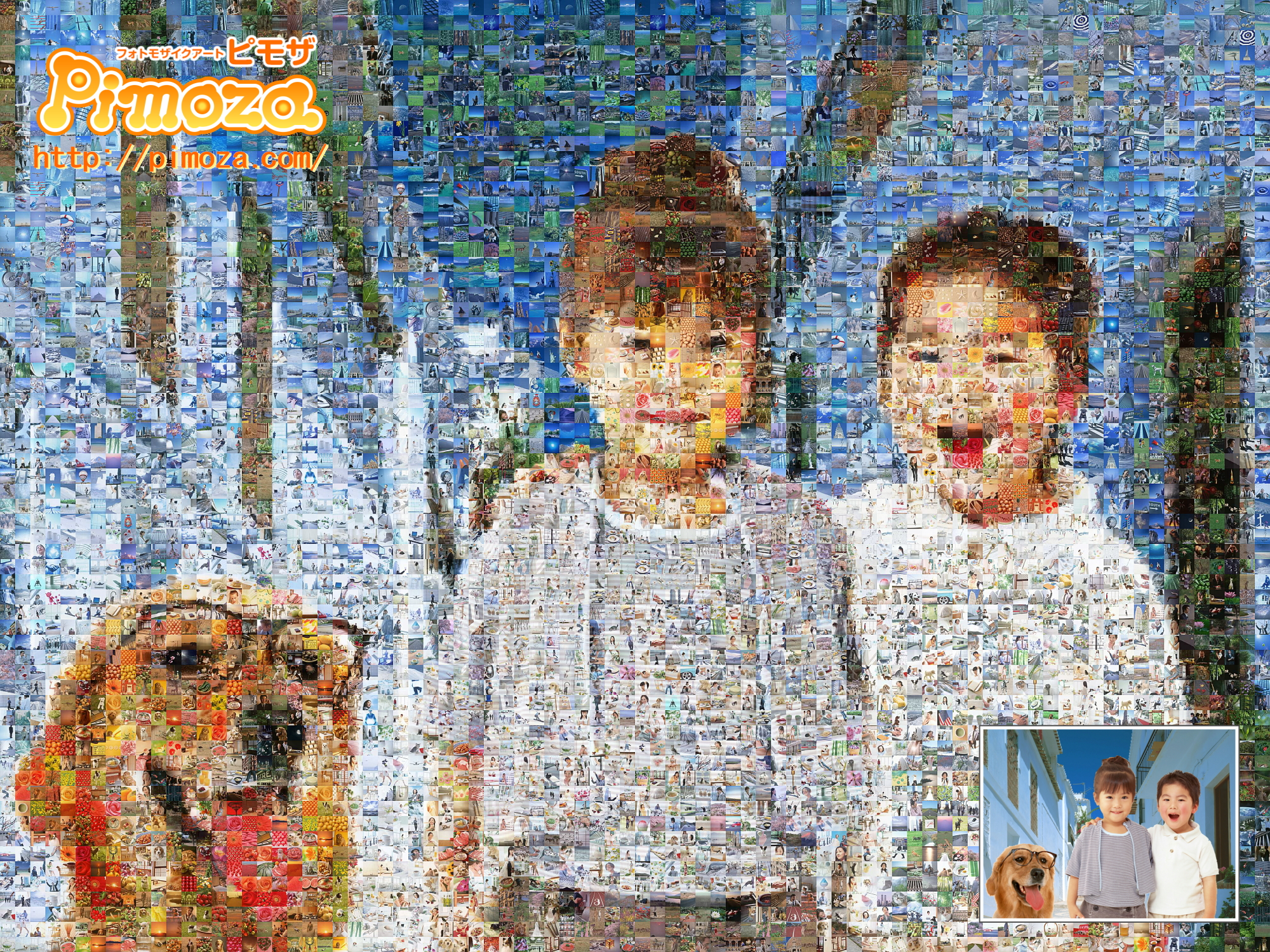 モザイクアート情報:・フォトパーツ形状=正方形 ・ベース画像合成度合い=20% ・埋め込みフォトパーツ数=5,292枚(約5,500枚の写真を2回重複利用して約11,000枚から自動選択。2回重複利用とは、準備したフォトパーツ用の写真が最大で2回使用されることですが、当社のシステムでは同一写真は隣接しないように自動制御しています)