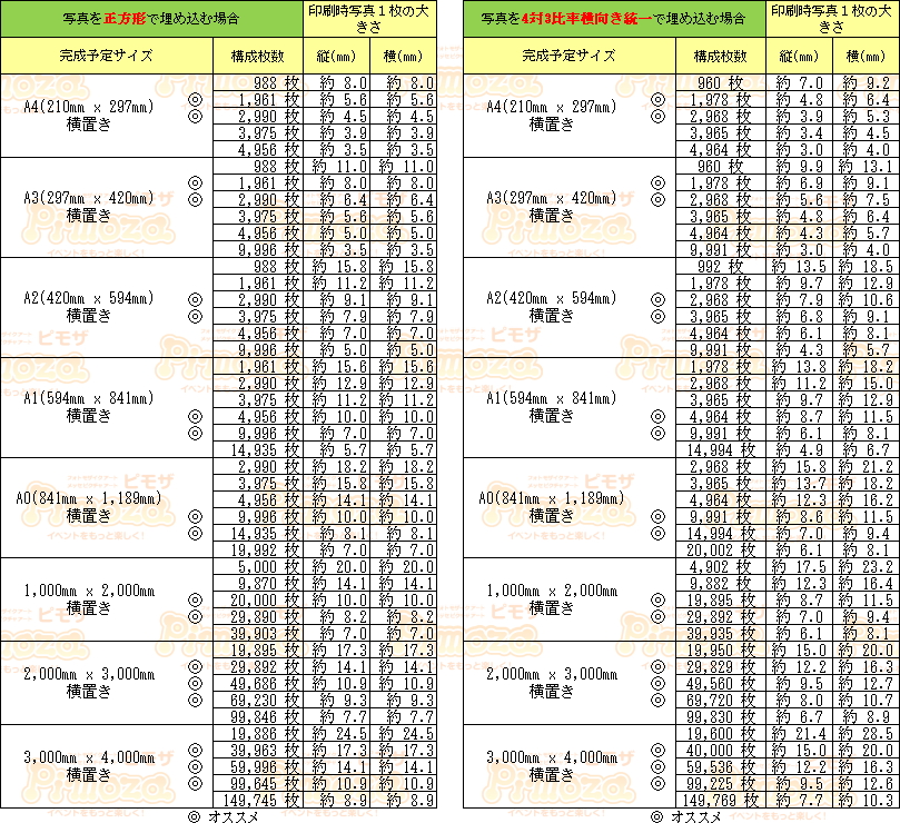 下の印刷サイズごとの構成枚数の例をご覧ください。(表をクリックすると拡大表示されます)これはあくまでも例で、フォトモザイクアートの目的等により構成枚数を変えてください。また、ペーストモザイクアートの場合には、写真の見やすさや貼り付けやすさ等のためにあえて写真1枚を大きくしたりしますので、表のオススメから1~2段階構成枚数が少なくてもいいでしょう。あるいは、写真を複数枚まとめて1枚の貼り付けパーツにする場合には、オススメの構成枚数のままでもいいです。